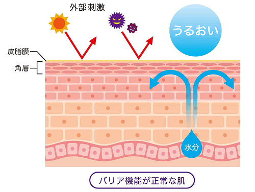 この皮脂膜と角層がスキンバリアとなって、乾燥・紫外線などの様々な外的刺激から肌を守り、ほどよい水分を保ちながら肌をすこやかに維持しています。