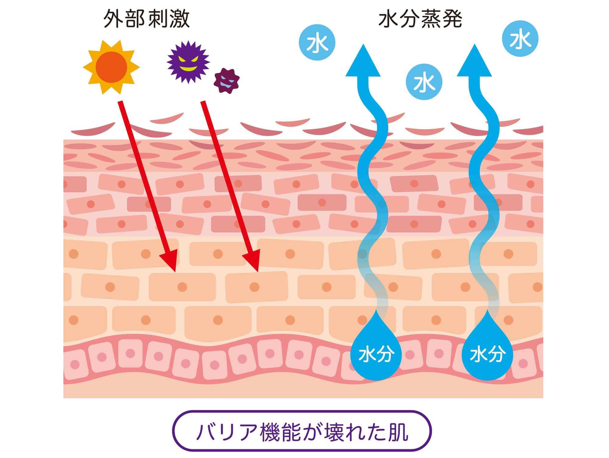 バリア機能が低下すると角層が乱れて皮脂膜が形成されず、肌内部の水分が蒸発し、乾燥。紫外線や外的刺激が侵入しやすくなります。
